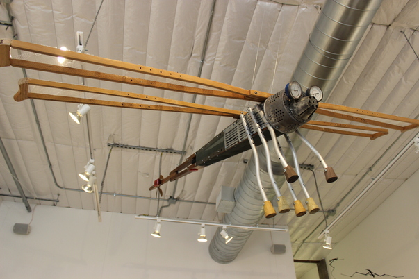 An artists industrial display of a fly is shown hanging from a ceiling.