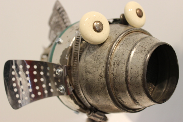 Ecclectic metal sculpture of a fish with a wide open mouth and beige eyes.