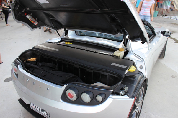 A tiny trunk is revealed on a tiny silver Tesla car.