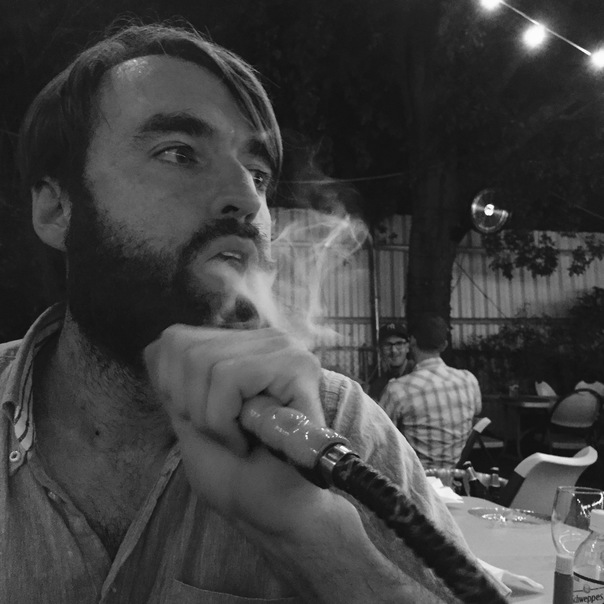 A bearded man is smoking from a hookah pipe at a table outdoors.