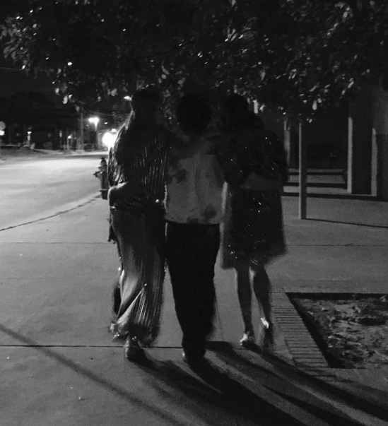 three people huddled together and walking down a sidewalk