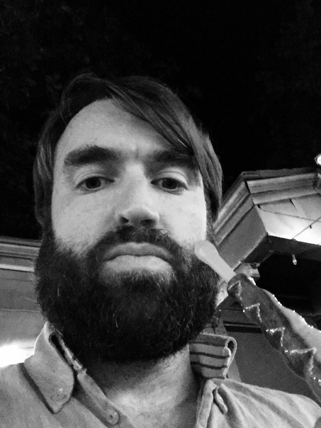 a bearded man stares into the camera in a gray photo with some utensil point towards his face.
