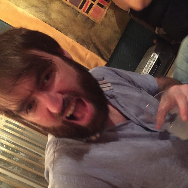 A bearded man in a blue shirt taking a selfie inside.