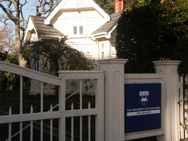 A white metal gate outside the University of Auckland in New Zealand, with a home behind the gate.