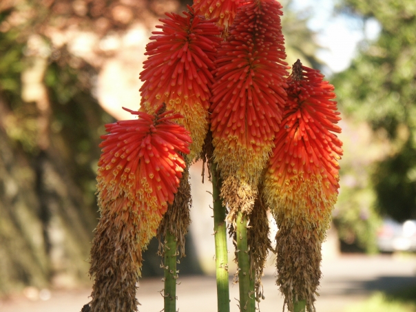 Several red, yellow and green plants are together on stems.