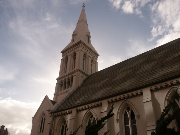 The large church has a sand colored exterior and holds many celebrations for it's members.