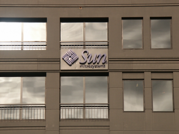 Clouds are reflected in windows of a Sun microsystems office building.