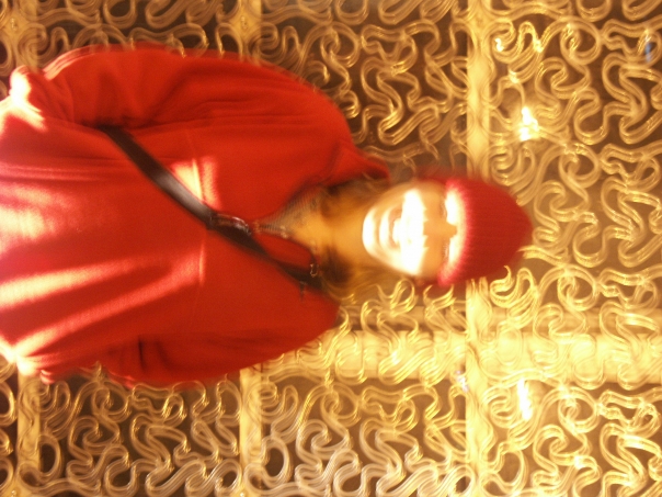 A blurry image displays a girl in a red beanie and hoodie standing in front of a brightly lit wall.