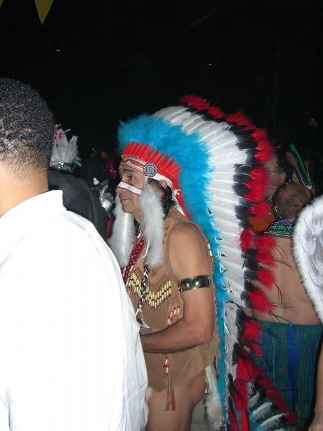 A man wearing a native american costume including a red, blue, white and black feather headdress