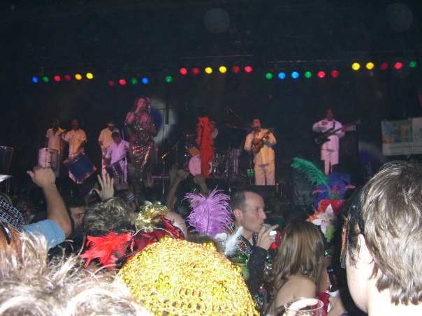 a nightime party in a latin counrty with a band playing and party goers dressed in colorful costumes.