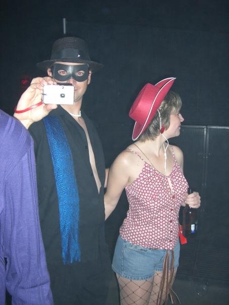 A man with a mask holding a camera and a woman in a cowoy hat.