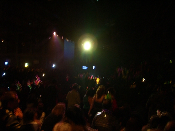People gather at an outdoor event in the middle of the night.
