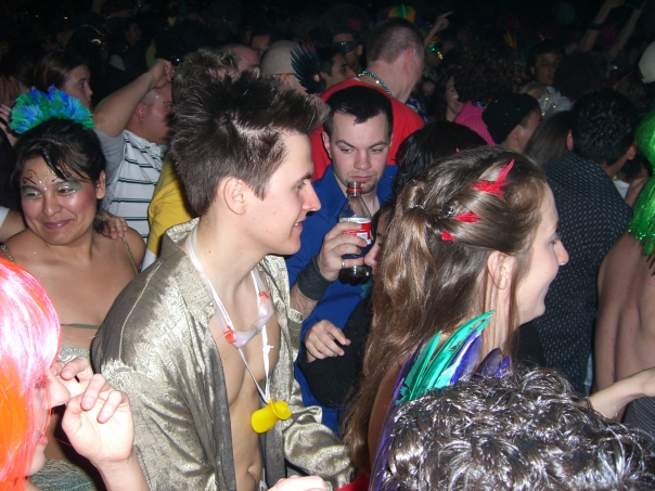 This photo appears to have been taken at a very lively party with a lot of young people. There is an attractive brown-haired young man at the center of the photo. He has on a silvery colored shirt that is completely unbuttoned in front showing off his chest. Around his neck, he has a medium long white cord with some yellow pendants. Behind him, is a young lady in a thin-strapped low-cut blouse or dress. She is noticeable for wearing silvery eye makeup and having some silver symbols pained on her forehead. She appears to have some symbols painted on her forehead. There is another young girl in the foreground who has orange-pinkish hair-either had her hair colored or wearing a wig. Another young woman has a layered hair-do with what appears to be red barettes in her hair. All in all, it looks like a fraternity party gone wild.