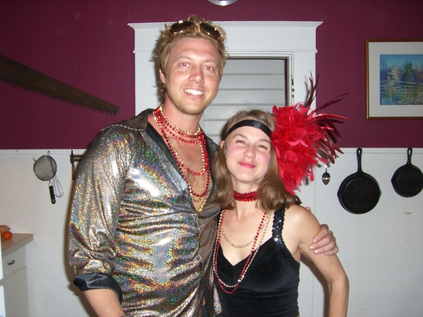 A young couple in mardi gras outfits, he is tall, she wears a black tank top, they are in a kitchen probably at a party.