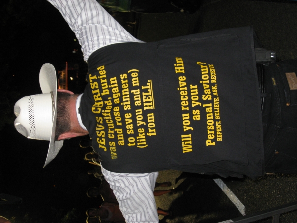 A singer in a country western band wears a vest explaining his religious beliefs while he performs.