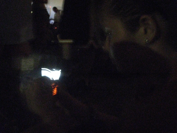 A woman is checking her cell phone messages in the dark. The cell phone is blurry in the photo.