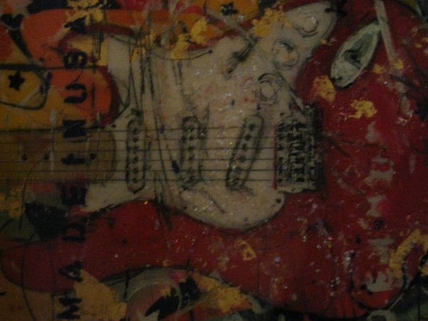 The image of a red guitar is colored in paint and glitter.