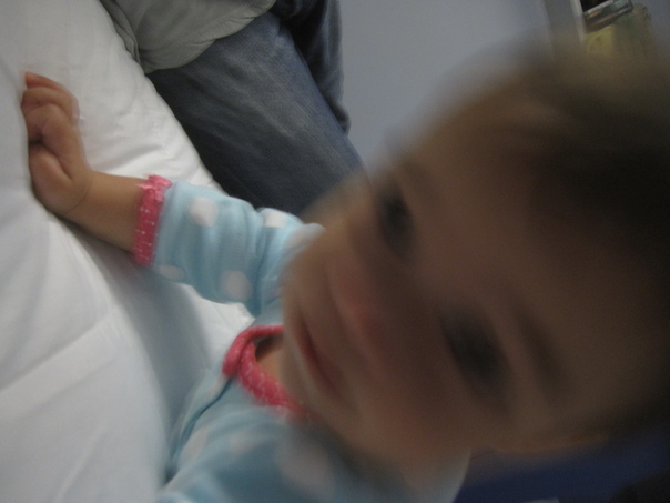 The baby in the blue onesie is crawling on the white sheet.