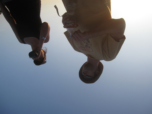 Upside down man and woman, man holding an Ozarka water bottle and woman drinking from a can.