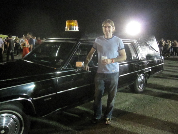 A man in a blue top and holding a glass in his left hand smiles as he poses before a black hearse.