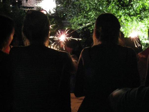 group of women celebrating by lighting crackers in the night time