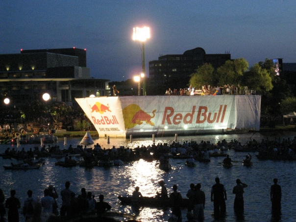 A very large banner advertises Red Bull, the presumed sponsor for this water event.