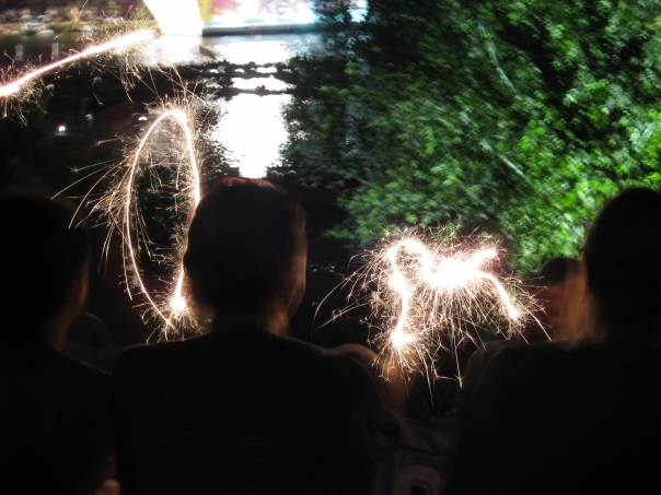 Lit sparklers painting the air in the hands of people who know that fire-writing is ageless fun.