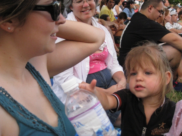 At a public gathering, a child wants to quench her thirst from her mother's water bottle while an admirer looks on.