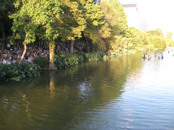This is a picture of a river there seem to be a lot of people on the bank and some are also in the water.