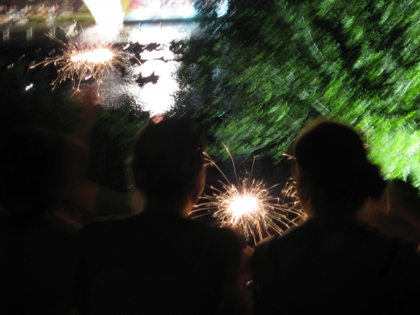 very blurry photo of a fourth of july celebration not enough detail and looks like the photographer was moving at the time
