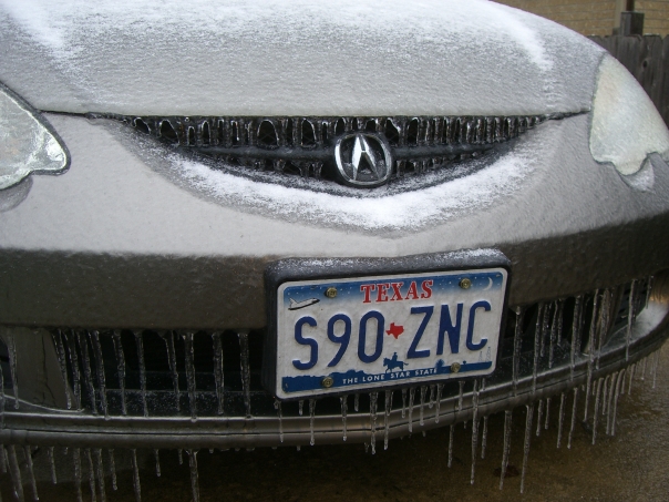 An Audi covered in ice and icicles in the Lone Star State of Texas.