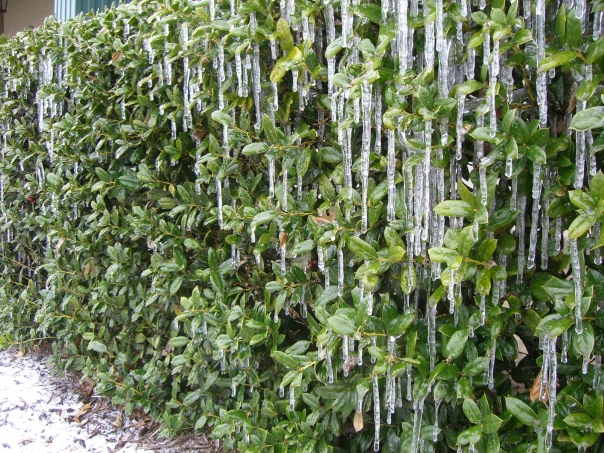 This is a picture of a green bush with icecicles hanging from it. Must have been an early frost.