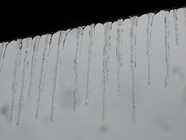 Icicles hanging from the roof in the process of melting.