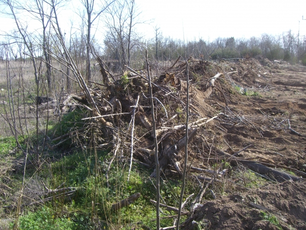 A ridge of debris from sticks and small trees that have been pushed to one side with dirt.