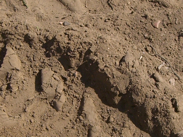 Crumbly dried mud and dirt with a few small rocks and twigs.