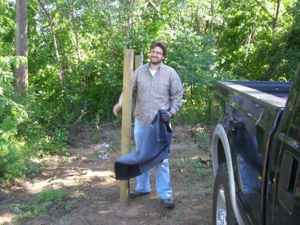 After I had already cleared the land, measured and planted the stakes, used the auger to create 3 ft deep holes, and set the posts by myself, it was finally time to install the fence.