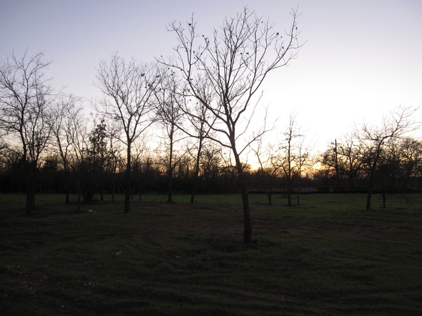 The bare branches of trees are seen as dark silhouettes against a light, cloudless sky.
