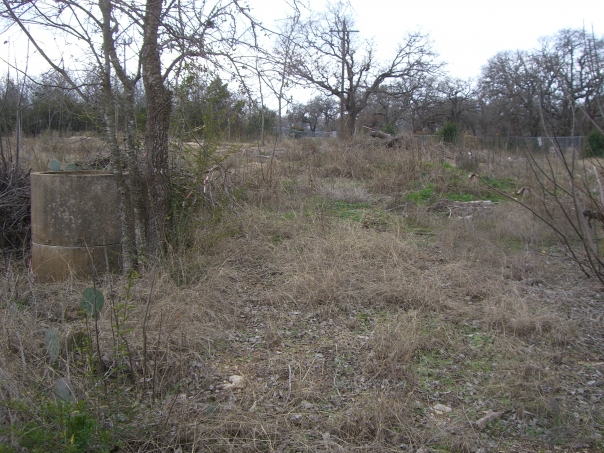 cement cylinder beside a tree. several trees and 2 structures in the distance