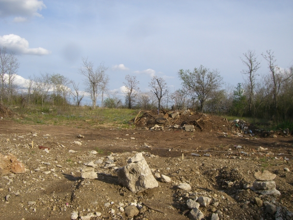 The rocks were scattered across the field and made for obstacles in the dirt path.