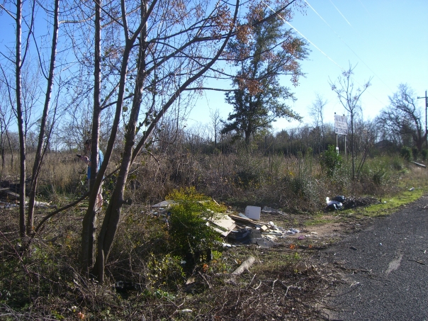 This scene shows debris and a man in a green shirt behind a tree by the side of an unpaved area.