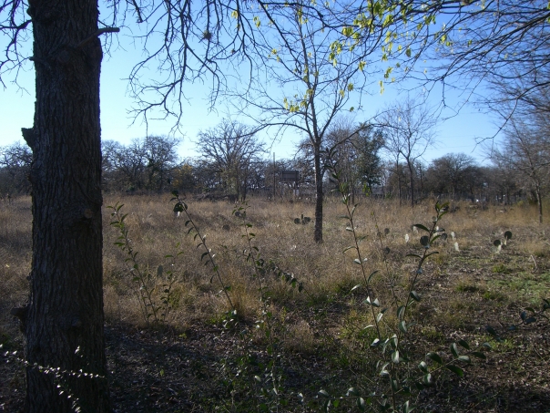 A wild field is surrounded by young trees with bare branches.