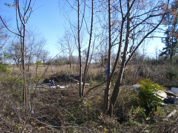 Debris is scattered over the ground in this view of a deserted woody area.