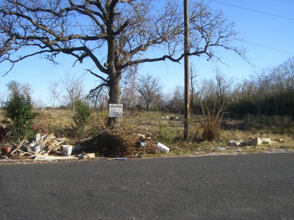 A bare trees, leaves are long gone, blue sky with zero clouds - and the field is surrounded my litter - with wood scraps and plastic buckets all over