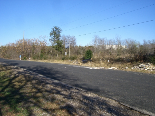 Litter is pilled up on the side of a road beside a tree line.