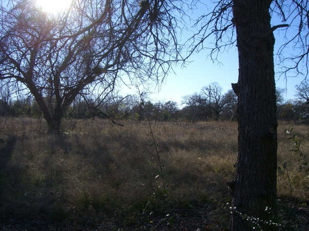 A few trees with bare branches are on the edge of a small field with tall, dried grass.