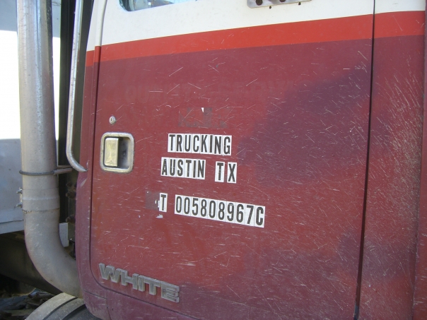 A semi truck's red and white door is visible, with part of the name visible. The company is from Austin, TX. A DOT number is printed.