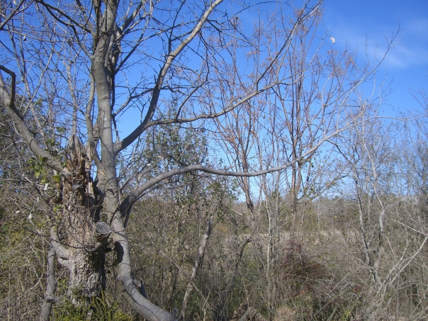 A tree with branches in the middle of dry brush.
