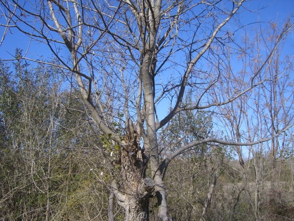 A tree without leaves in front of much of the same.