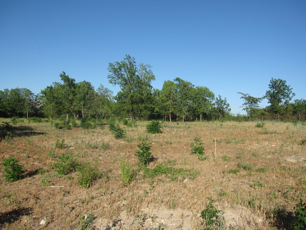 A large plain is covered with brown grass and dirt, and spotted with green bushes.