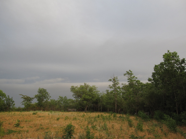 The top of a hill with dead grass and green leaf covered trees with a blue-grey cloudy sky.